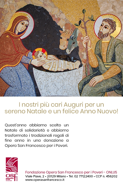La tua azienda può contribuire a regalare un Natale migliore a chi non ha niente. Scegli un Natale di solidarietà destinando la somma prevista per i tradizionali regali aziendali a sostegno dei servizi di Opera San Francesco per i Poveri. In questo modo la tua azienda contribuirà a fare un dono speciale a chi è povero dando continuità alla nostra missione quotidiana. È possibile poi comunicare questa scelta di solidarietà con i biglietti augurali in formato cartaceo o formato elettronico di Opera San Francesco per informare clienti, collaboratori e fornitori della donazione per i poveri effettuata dall’azienda. Biglietti d’auguri in formato cartaceo Scarica il modulo di adesione Visualizza il biglietto d’auguri Potrai optare per biglietti neutri oppure personalizzarli con il nome e il logo e scegliere di farli spedire direttamente da Opera San Francesco. Ogni biglietto riporta una frase che informa i destinatari della scelta di solidarietà operata. Biglietti d’auguri in formato elettronico Scarica il modulo di adesione Visualizza il biglietto d’auguri Potrai optare per messaggi neutri oppure personalizzarli con il nome e il logo dell’azienda. Inviaci logo aziendale e sito web, eventuale testo personalizzato da aggiungere al messaggio, indirizzo email da usare come mittente e l’elenco dei contatti (in formato excel) a cui effettuare l’invio. Informazioni Maria Picano Telefono02-77.122.408 Fax02-77.122.410 E-mailauguri@operasanfrancesco.it Newsletter Iscriviti alla nostra newsletter per rimanere aggiornato sui progetti e sulle iniziative di Opera San Francesco. I dati saranno trattati come indicato nelle informazioni sul trattamento consultabili qui. Resta aggiornato, iscriviti alla nostra newsletterIscriviti